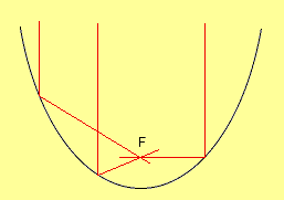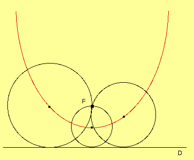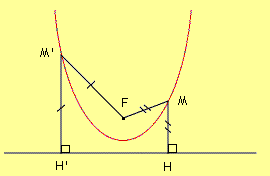 Voici une 2ème façon de définir la parabole : considérons une droite D et un point F n'appartenant pas à la droite D. L'ensemble des points situés à égale distance de F et de leurs projetés orthogonaux H sur la droite D forme une parabole. On a ainsi : MF = MH ou alors MF/MH = 1 |