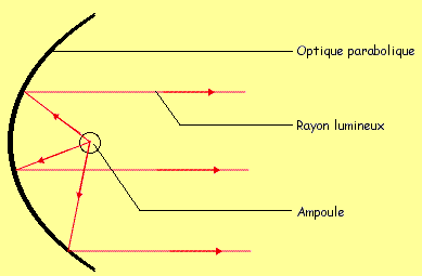 Les voitures sont munies de phares aux optiques paraboliques afin d'obtenir un éclairage puissant et unidirectionnel. Pour cela, il suffit de placer une ampoule au niveau du foyer des optiques paraboliques qui captent les rayons lumineux et les réfléchissent tous dans une même direction. En effet comme tout rayon lumineux perpendiculaire à la droite directrice d'une parabole, passe par son foyer après s'être réfléchi sur la parabole, on peut dire réciproquement que tout rayon émis du foyer d'une parabole, repart perpendiculairement à sa droite directrice après s'être réfléchi. |